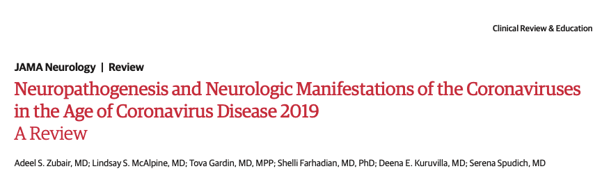 Adeel S. Zubair, Lindsay S. McAlpine, Tova Gardin, Shelli Farhadian, Deena E. Kuruvilla, Serena Spudich. Neuropathogenesis and Neurologic Manifestations of the Coronaviruses in the Age of Coronavirus Disease 2019. JAMA Neurology Published online May 29, 2020