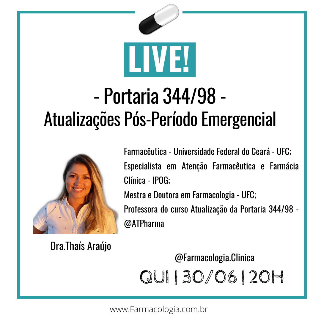 Para essa live teremos uma novidade! A Dra. Thaís tem um curso excelente sobre as Atualizações da 344/98 e nós iremos sortear na live uma inscrição para vocês!